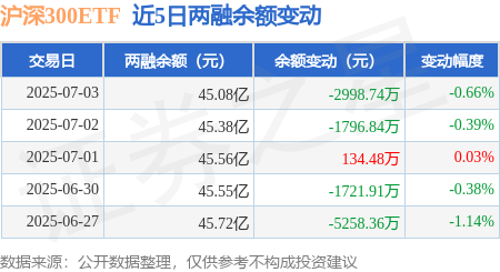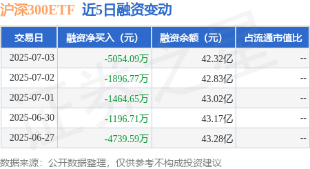 本站消息,7月3日,沪深300ETF(510300)融资买入1.55亿元,融资偿还2.05亿元,融资净卖出5054.09万元,融资余额42.32亿元。